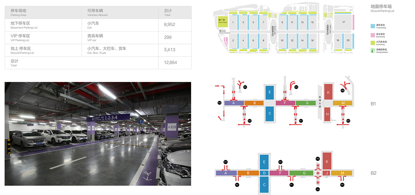 深圳国际会展中心地下车场共计两层,提供9,045个车位,其中10%的地下停车位配有充电桩。