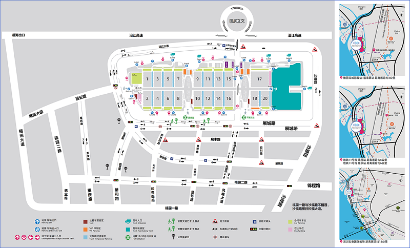 地铁: 地铁12号线、20号线直通展馆南、北登录大厅,可快速往返深圳市区及机场。
