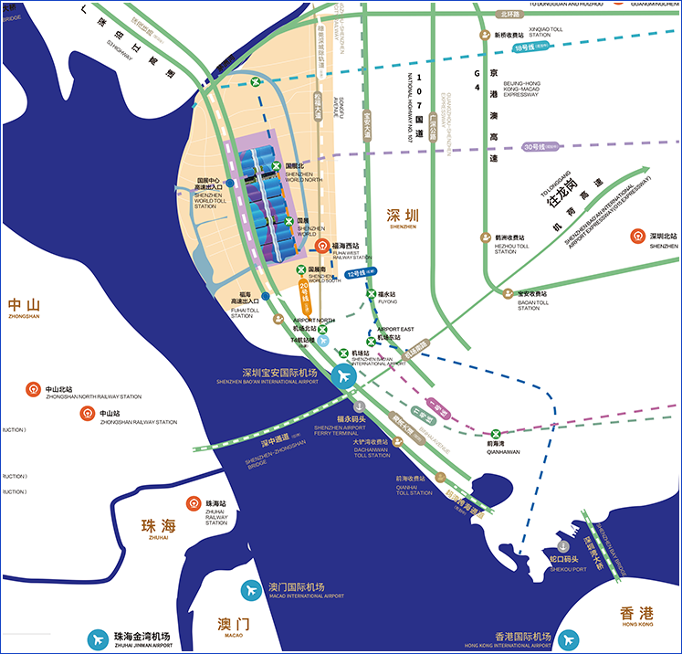 航空:展馆位于深圳宝安国际机场以北,距深圳机场T3航站楼约7km,距T4枢纽仅3km,毗邻香港机场。