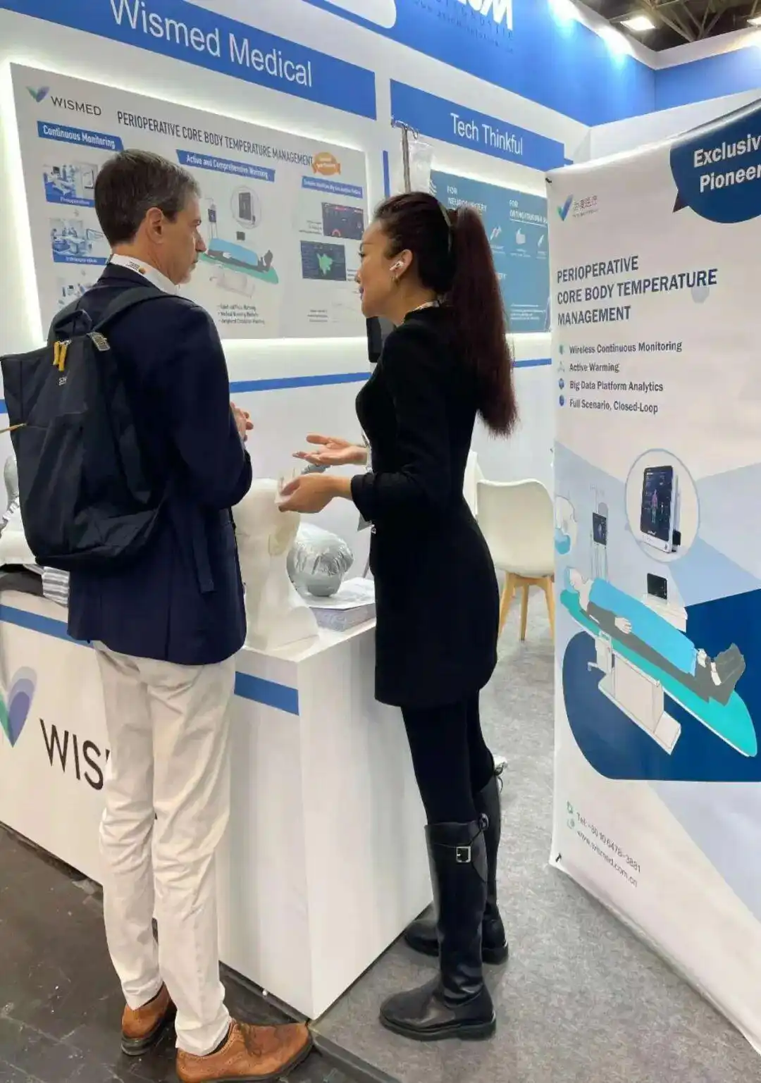 为麦智能科技(北京)有限公司(以下简称“为麦医疗”)展区的工作人员现场模拟了“新一代智能全自动化围术期体温管理解决方案”的临床应用。该方案采用创新的“四合一综合式升温管理”设计,将医用升温毯、输血输液加温仪、末梢循环加热装置与控制主机高度集成,形成一套协同运作的升温系统。其通过无线可穿戴体温传感器与复合式升温设备的智能联动,构建了完整的测温保温闭环管理体系,能够在监测到患者体温异常时自动开启保温设备,并根据患者与目标体温的差值自动调整加热曲线,实现预测式升温管理。
